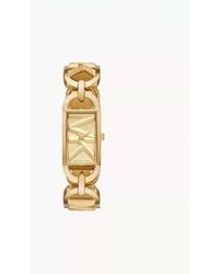 Go to Michael KorsThis gold-tone watch is proof that keeping track of time is an easy and stylish task. Featuring rows of sparkling pavé accents, this style’s shapely padlock dial and curb-link bracelet are inspired by