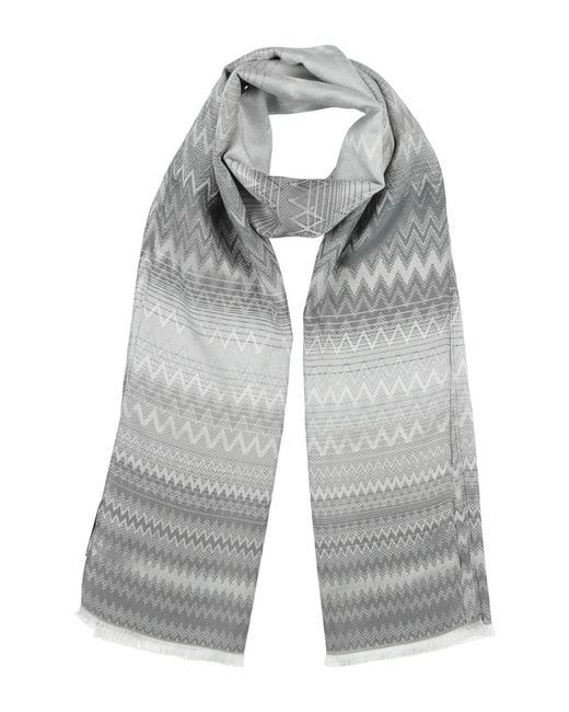 MISSONI. stole, jacquard, signature print, fringes, dry clean, do not bleach, do not tumble dry. 77% Viscose, 23% Silk. Colour: grey