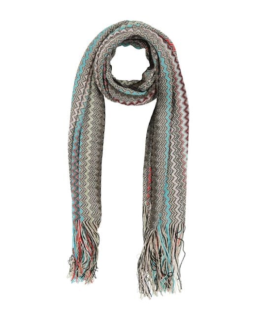 MISSONI. scarf, crochet-knit, metallic, lightweight knit, signature print, fringes, dry clean, do not bleach, do not tumble dry. 89% Viscose, 11% Polyester. Colour: blue