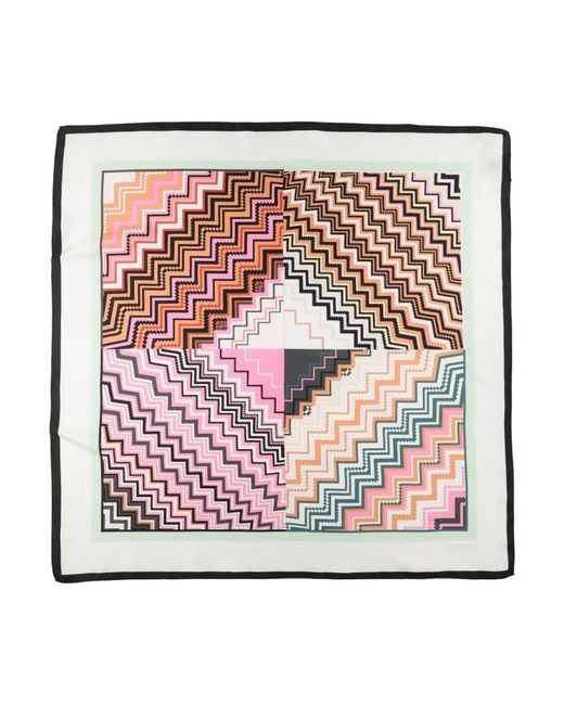 MISSONI. square scarf, twill, signature print, brand logo, dry clean, do not bleach, do not tumble dry. 100% Silk. Colour: pink