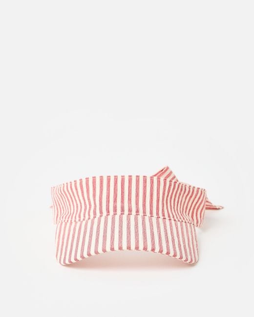 Stay cool in the warmer months with this red and white striped visor featuring an adjustable back that ties into an on-trend bow for a little feminine flourish. Complete with an embroidered strawberry on the back for a playful finishing touch. Colour: pink