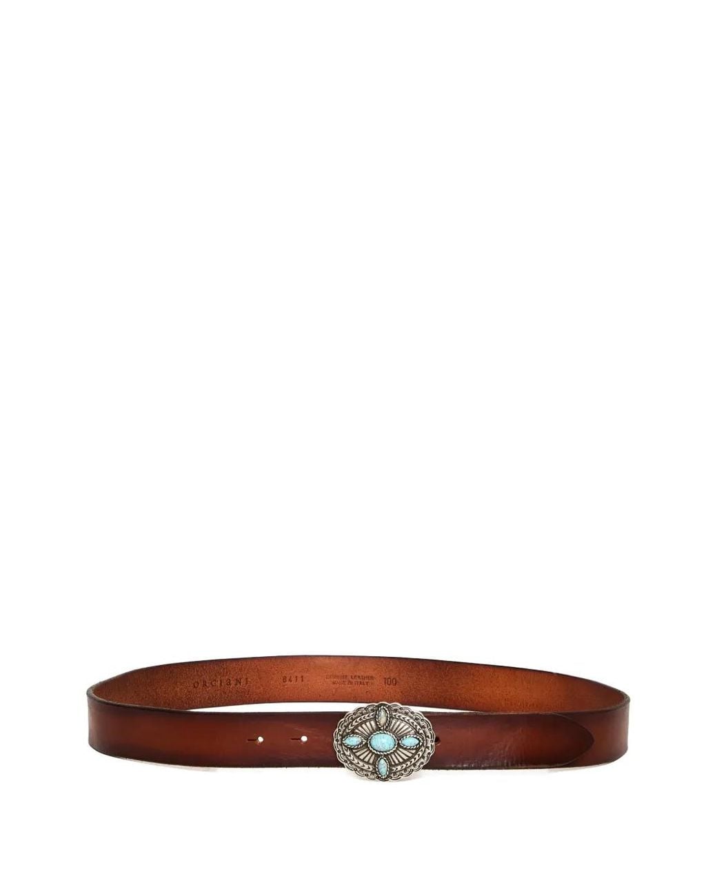 Brown leather brushed finish turquoise-embellished plaque buckle engraved silver-tone hardware adjustable fit punch-hole detailing Size: OS. Gender: Male. Material:Calf Leather/Turquoise/Metal.