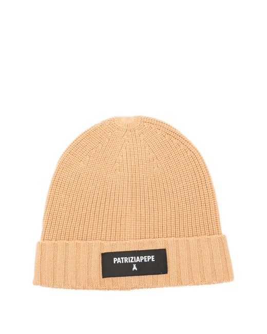 Caramel beige ribbed knit turn-up brim logo patch Size: One Size. Gender: Female. Material:Acrylic/Wool. Colour: natural