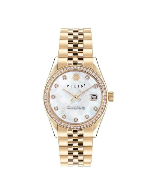 The Philipp Plein Date Superlative is a gold-coloured quartz watch that pairs luxurious styling with everyday durability. It is designed as a statement accessory with practical features for daily wear. Key attributes: Yellow | Gold | Stainless steel | Water resistant to 5 bar | Mineral glass | Quartz movement | Date display | Stainless steel bracelet | Gold-coloured stainless steel case and bracelet | Composition & care: Stainless steel | Mineral glass Colour: metallic
