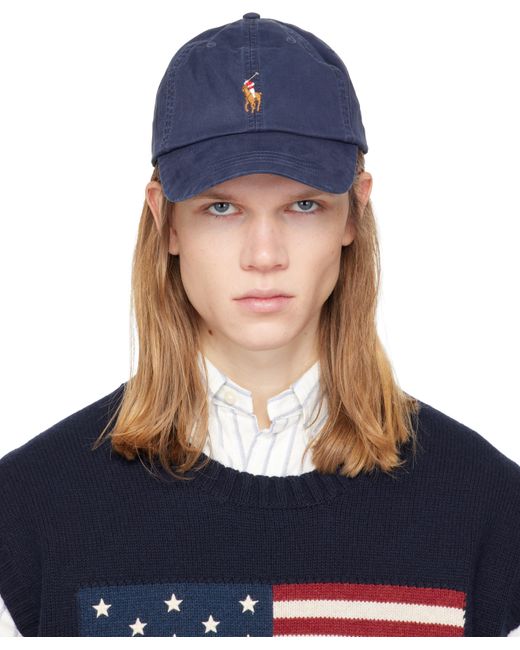 Stretch cotton twill cap. · Embroidered eyelets at crown · Logo graphic embroidered at face · Curved brim · Logo embroidered at back face · Adjustable grained leather cinch fastening Supplier color: Nautical ink Colour: blue