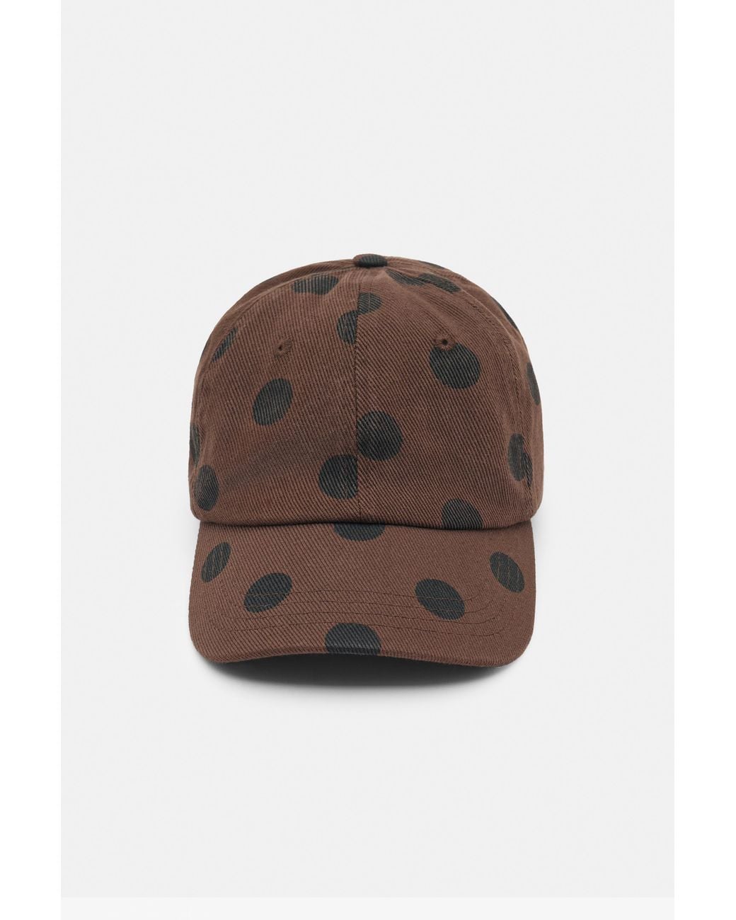 Chocolate brown cap with black polka dot detail, peak and adjustable back fastening. Colour: brown