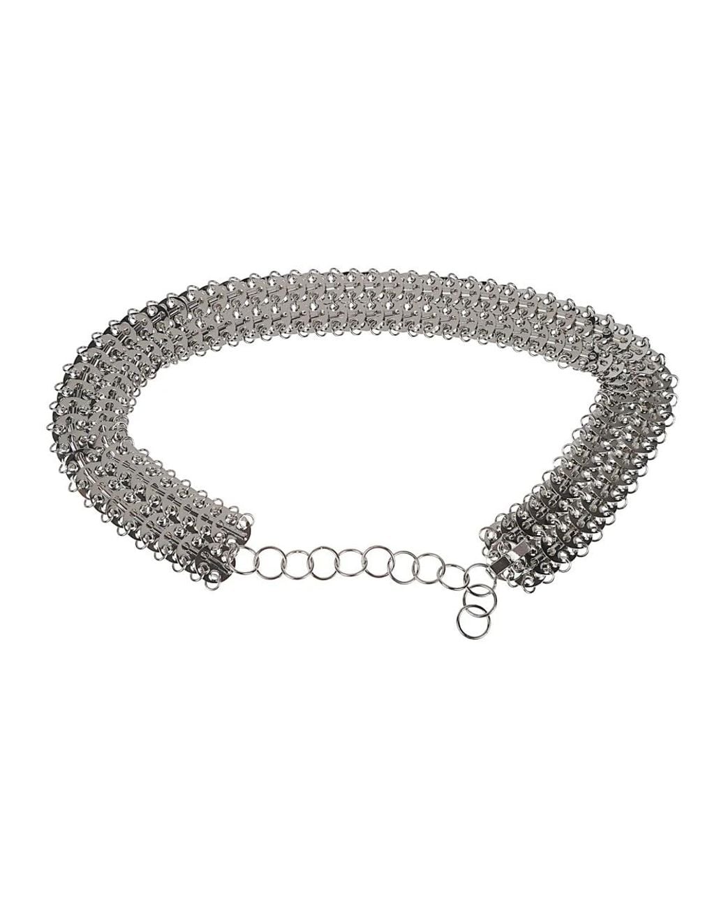 Rabanne 1969 Jewellery Belt is a jewelry-inspired disc chain belt that adds a luminous, statement touch to waistlines. The silver-tone construction is designed for adjustable, one-size wear. Key attributes: Grey | Silver | Brass | Adjustable hook fastening | Adjustable size | Disc chain-link construction | Silver-tone finish | Jewelry-inspired detailing | Dimensions & fit: One size, adjustable fit | Composition & care: 100% brass Colour: metallic