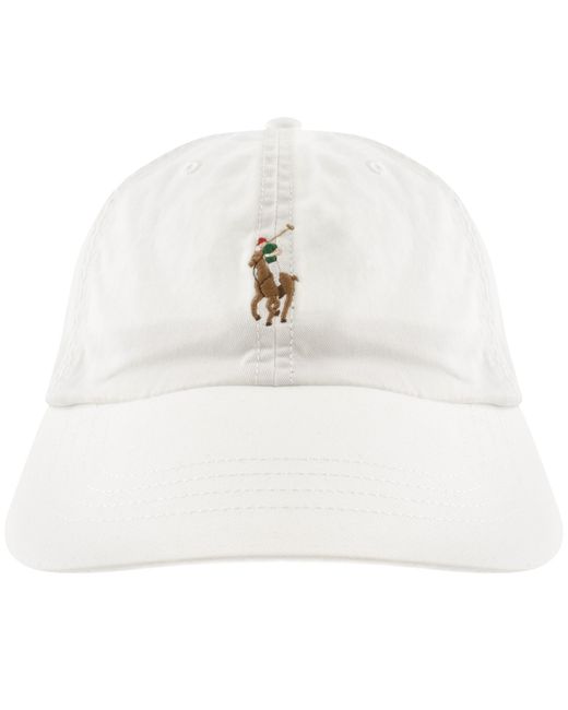Ralph Lauren Classic Baseball Sport Cap In White. A six panel baseball style cap with a stiff rigid peak at the front. An adjustable brown leather strap is situated on the reverse which features a distressed metal buckle. The signature Ralph Lauren Polo Player logo is embroidered on the front of the cap with Polo Ralph Lauren embroidered on the reverse in navy. Embroidered eyelet detail around the top of the cap for ventilation. A pale blue trim features on the interior. Quality: 97% Cotton and 3% Elastane. Strap: 100% Cow Leather. Colour: white