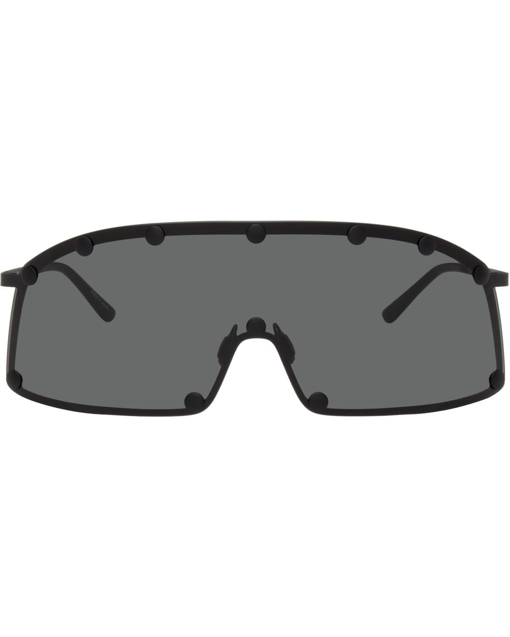 Shield-style stainless steel-frame sunglasses. · Grey lens with rivets at face · Adjustable nose pads · Rubber temple tips · Includes pouch Supplier color: Black/Black Colour: black