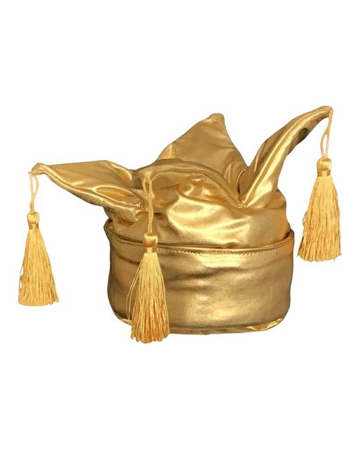 This fun insulted winter toque is made of a soft stretch metallic fabric. This unique piece converts from a tasselled toque to a playful crown headband with easy to manipulate top. Pop your pony tail, braids, twists or natural curls out of the top. Uncuff it, to make it deep, and cover all of your hair. This crown is a cuffable 12 inches tall (30cm) and stretches to fit most. Spot clean, wipe clean with a wet cloth fabric contents: exterior: 80% nylon, 20% spandex interior: polyester fibre fill, aluminum wire Sewn in a solar powered atelier in the Bronx, NY Colour: yellow