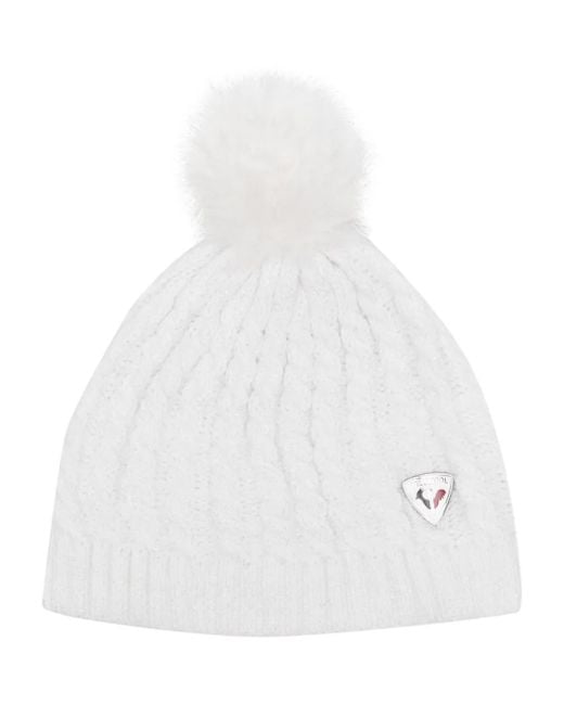White cable knit logo patch to the front pompom detail ribbed hem pull-on style Size: One Size. Gender: Female. Material:Polyester/Acrylic/Polyester/Metallic Fibre. Colour: white