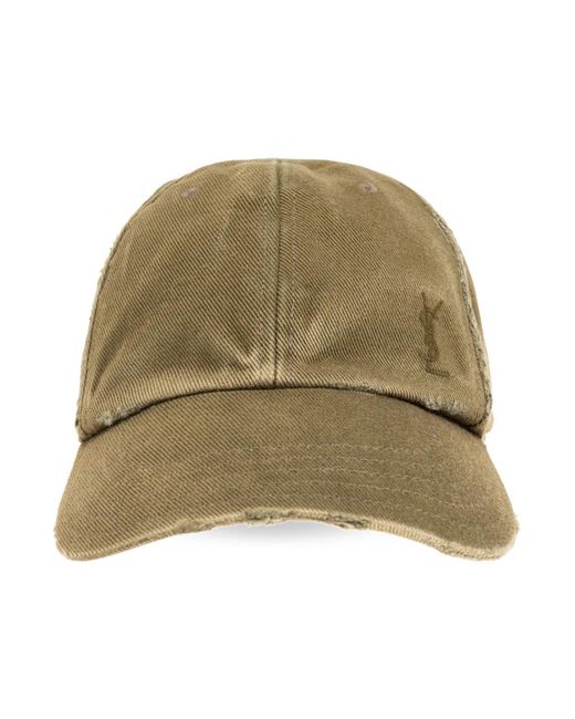 Saint Laurent Cassandre Washed Denim Baseball Cap updates a classic with a distressed washed-denim finish and tonal Cassandre embroidery. Designed for everyday wear, it pairs casual texture with an adjustable fit for comfort. Key attributes: Khaki | Cotton | Adjustable back strap/closure | Grosgrain ribbon lining | Distressed six-panel construction | Tonal Cassandre embroidery at front | Curved brim | Frayed/lightly distressed twill finish | Dimensions & fit: Brim length: 2.75 in | Size 57 circumference: 21.19 in | One size with adjustable back strap | Adjustable fit | Composition & care: 100% cotton (shell) | Embroidery: 100% polyester Colour: green