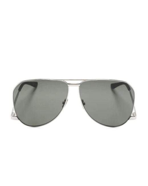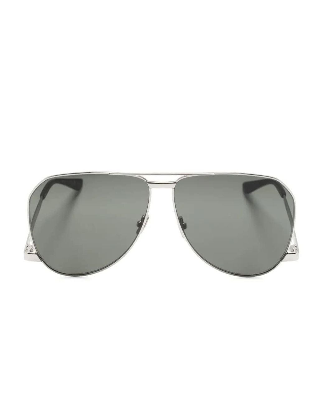 Saint Laurent presenta questi occhiali da sole con montatura aviator in metallo, lenti in nylon, doppio ponte e aste basse.