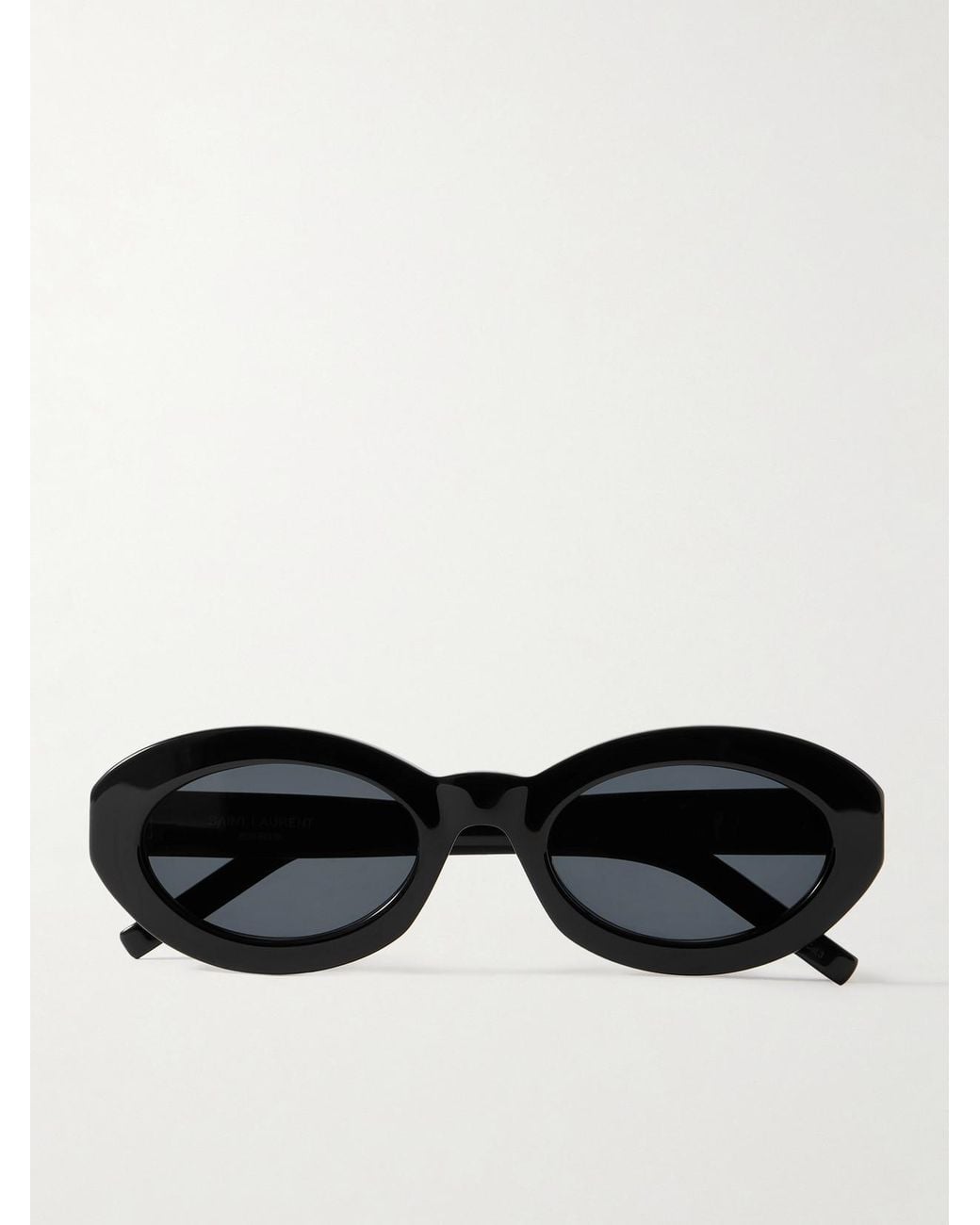 SAINT LAURENT Eyewear's sunglasses have chunky oval-shaped frames that give them a cool, retro vibe. They've been made in Italy from black acetate and feature a hinged, tiny version of the iconic 'YSL' plaque at the temples. Colour: black