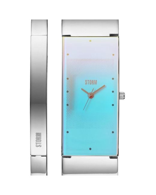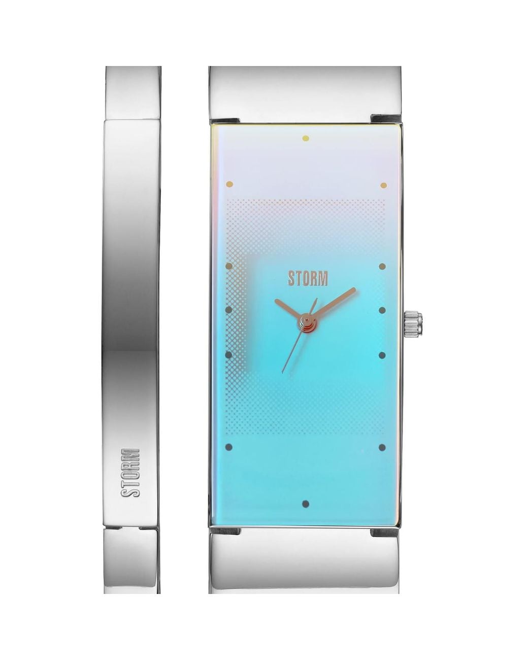 The Storm Alvara is a unique bangle watch with a cut out design on its silver strap and STORM's signature lazer aqua glass. Made from stainless steel, this highly polished watch makes a real fashion statement! STORM watches are made from high quality sustainable materials which are responsibly sourced and recyclable. Features: Double Case Movement: Japanese Case Material: Stainless Steel Water Resistance: No Lens Material: Mineral Plating: IP Gold Caseback: Stainless Steel Crown: Stainless Steel Band Type: Stainless Steel Fitting Size: 180mm Adjustable Clasp Type: Jewellery Weight: 113g Colour: blue