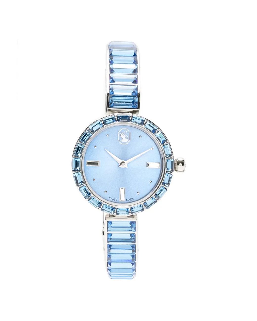 Blue dial quartz movement round case crystal embellished bezel baton hands bangle bracelet This item comes with a standard two-year warranty from the boutique. Size: One Size. Gender: Female. Material:stainless steel/Swarovski Crystal. Colour: blue