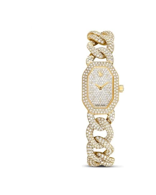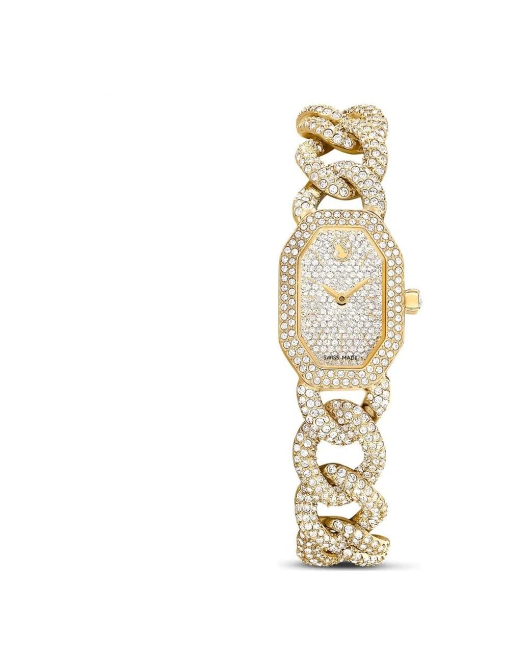 Swarovski Dextera Chain Watch blends an octagon-shaped case with jewelry-level sparkle for a statement timepiece. Its 815 crystals and adjustable crystal-embellished gourmette chain make it suited for everyday glamour and special occasions. Key attributes: Yellow | Gold | Crystals, Gold-tone PVD | Water resistant to 30 m | Swiss made | Adjustable gourmette chain | Fold-over clasp | Quartz mechanism | Octagon-shaped case | Pavé bezel | Dial set with 192 round-cut crystals and signature swan logo at 12 o’clock | Single crystal set in crown | Adjustable gourmette chain embellished with crystals | Gold-toned finish | Dimensions & fit: Case size: 44 x 20 mm | Case thickness: 7 mm | Band wearable length (minimum - maximum): 15.1 cm - 16.8 cm | Band width: 1.4 cm | Composition & care: Crystals | Gold-tone PVD Colour: metallic