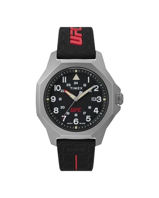 Discover the Timex UFC Reveal watch for men, featuring a sleek design with a 41mm stainless steel case and a black silicone strap. This analog watch has a mineral glass display, quartz movement, and is water-resistant up to 10.00 bar. Add a touch of style to your outfit with this versatile timepiece from Timex. Colour: black