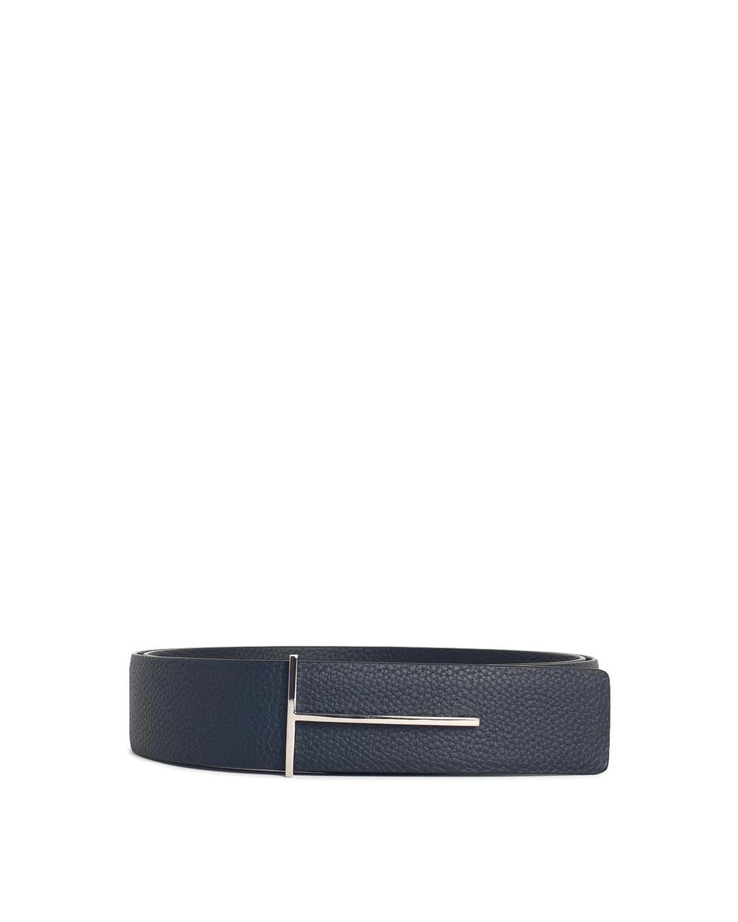 Made of grainy leather, black interior, tonal embossed logo, silver reversible t-shaped buckle\nthickness 3.7 cm Colour: blue
