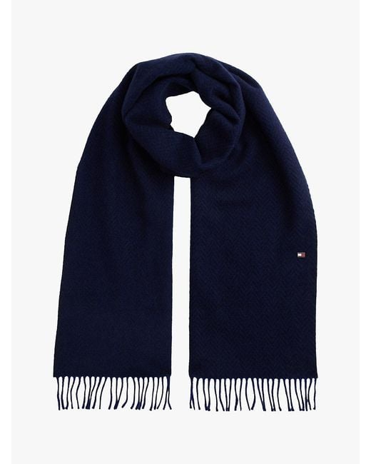 Men's Blue Pure Wool Herringbone Fringed Scarf