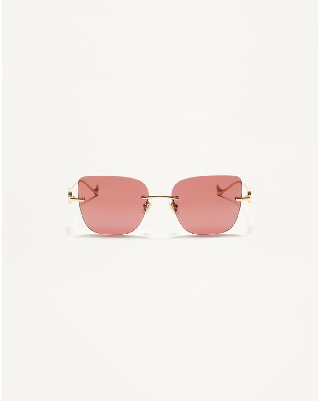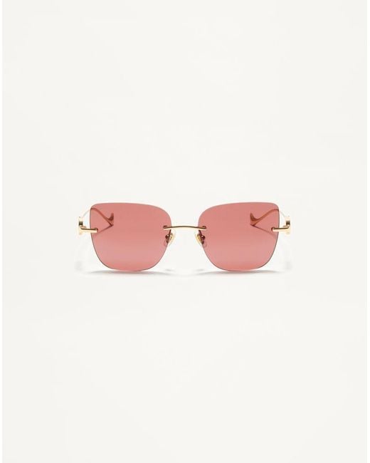 Rimless frame that highlights the distinctive temple structure, featuring a visible metal VLogo. The cat-eye structure boasts an all-metal frame, complemented by comfortable acetate temple tips. FEATURES - Lens base: S04 Lens category: 3 Lens material: Bio Nylon - UV transmittance: 0% - Not Suitable for prescription - Packaging: microfibre lens cloth with VLogo - Hard ivory moiré case - Made in Japan MEASUREMENTS - Temple length: 14 cm / 5.5 in. - Overall frame width: 13.1 cm / 5.2 in. - Lens width: 5.4 cm / 2.1 in. - Lens height: 4.6 cm / 1.8 in. - Bridge: 1.7 cm / 0.7 in. Colour: pink