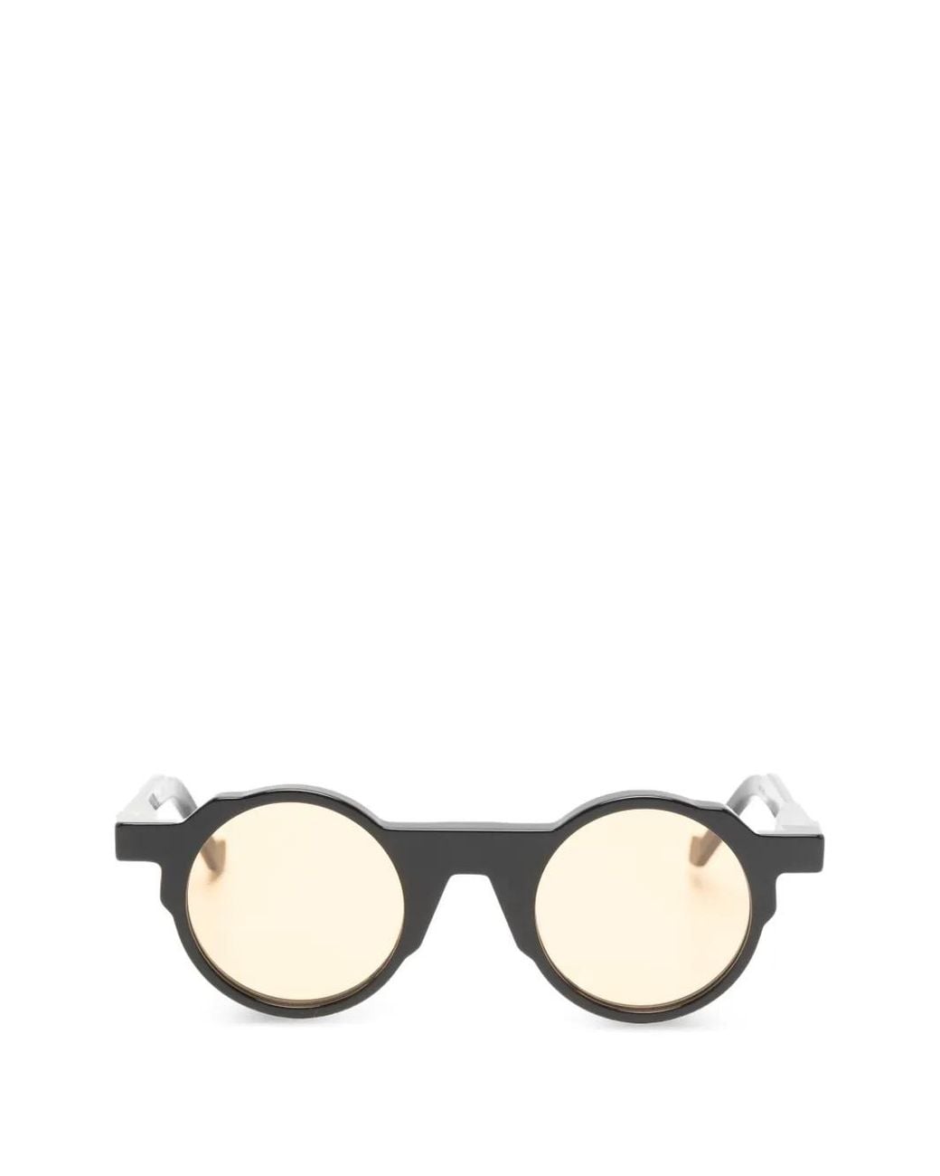 Black round frame silver tone detail light yellow lenses curved temples These glasses come with a protective case. Size: 45. Gender: Unisex. Material:Acetate/Aluminium. Colour: natural