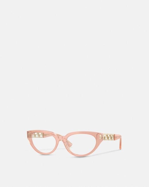 These cat-eye optical glasses feature the Greca motif on the metal temples and a laser-engraved Versace logo on the lug. Colour: natural