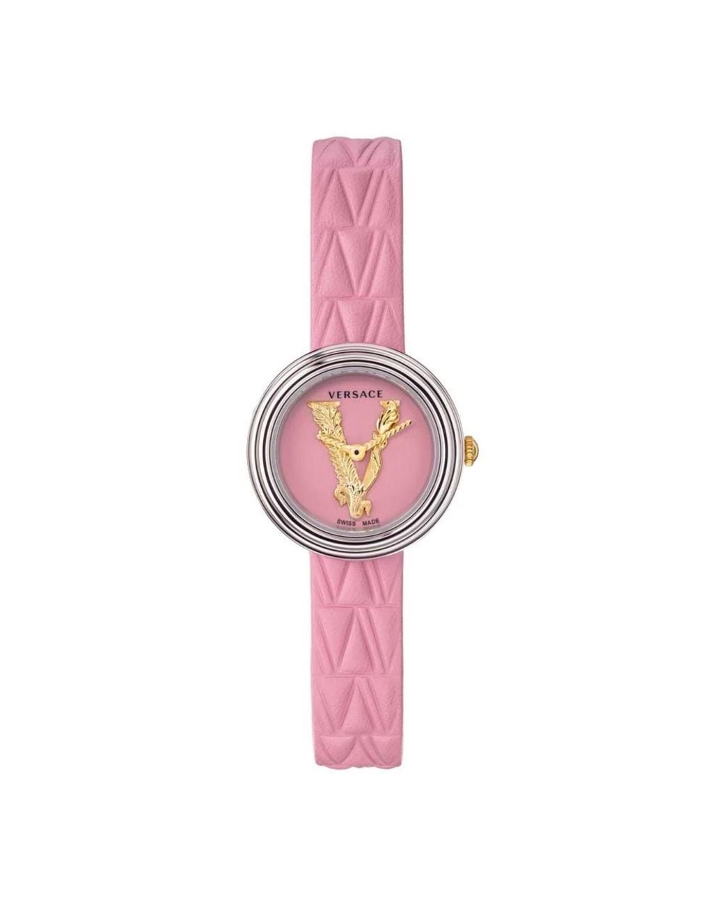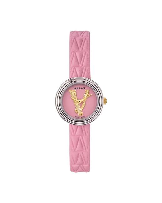 Introducing the Versace Vet 3010 21 Virtus Mini Womens Watch. This stunning timepiece features a pink leather strap and a pink/gold dial, exuding femininity and elegance. The stainless steel case and sapphire glass ensure durability and protection. With a 28mm case size and quartz movement, this watch is both stylish and reliable. The fold-over clasp provides a secure fit, while the 5 ATM water resistance adds practicality. Elevate your accessory game with this Versace watch.