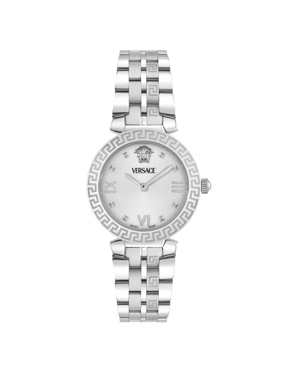 Versace analog watch with a round case, white dial and Greek-pattern bezel, finished with a silver‑tone link bracelet. Key attributes: Grey | Silber | round case | white dial | Greek-pattern bezel | silver-tone link bracelet | elegant design Colour: metallic