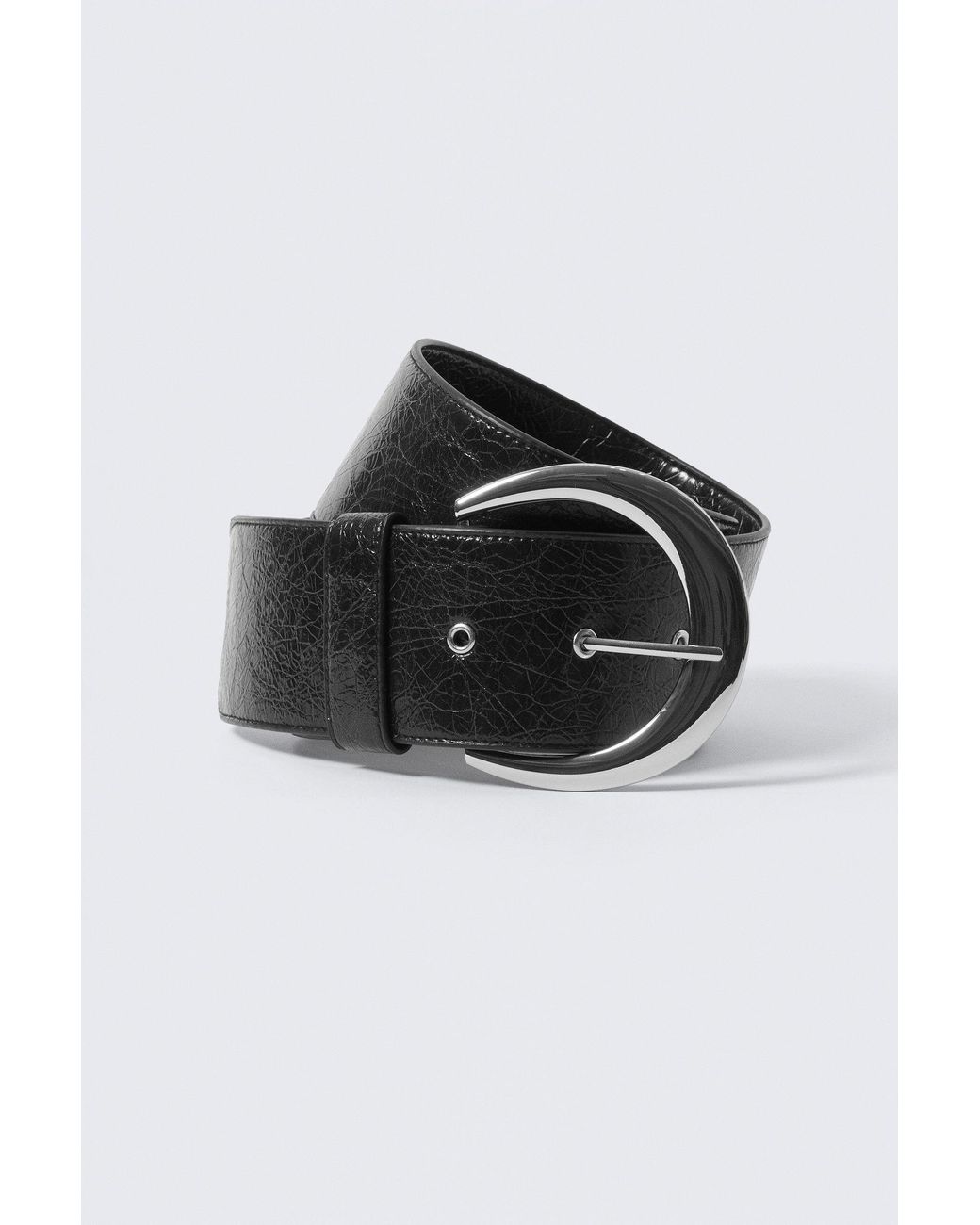 A wide belt crafted from faux leather with a textured finish. Designed with a large rounded metal buckle and reinforced eyelets for adjustability. Colour: black