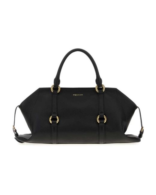 The Alexander Mc Queen Farringdon Bag is an elongated calf leather handbag featuring harness-inspired belt straps and adjustable capacity. It balances structured styling with versatile carrying options for everyday or dress occasions. Key attributes: Black | Calf leather | Durable grainy calf leather | Structured shape for organized storage | Adjustable side buckle straps to vary capacity | Removable, adjustable shoulder strap | Top zip closure | Can be carried handheld or worn on the shoulder | Elongated silhouette | Tubular top handles | Belt-style side straps with buckles | Gold-tone metal hardware | Dimensions & fit: Width: 44 cm | Height: 25 cm | Depth: 12 cm | Handle height: 12 cm | Min shoulder strap length: 50 cm | Max shoulder strap length: 62 cm | Composition & care: Exterior: 100% calf leather | Lining: 100% fabric | Hardware: gold-tone metal Colour: black