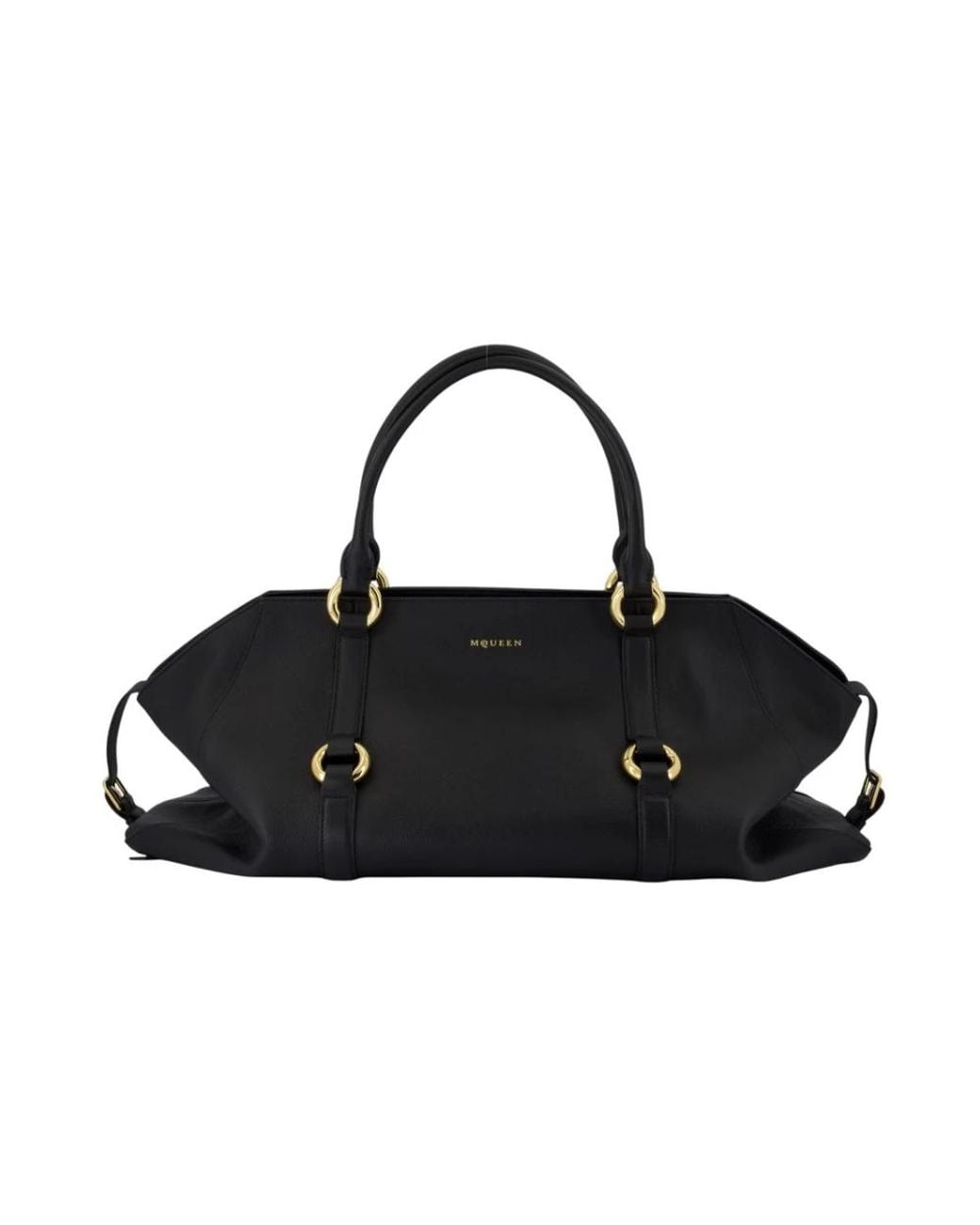 Elevate your style with this luxurious Alexander Mc Queen handbag in black and gold. Crafted from grainy calf leather, this bag features two top handles, a top magnetic clasp closure, and an interior with one zipped pocket and one flat pocket. Perfect for the modern man who appreciates quality and sophistication. Colour: black
