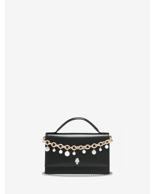 The top handle skull bag – smooth black calf leather with a silver-finished skull and a leather top handle. Detailed with a chunky gold chain with metallic spheres and imitation pearls. The bag can be worn either hand-held with its removable chain strap or over the shoulder by doubling up the chain or across the body. Colour: black