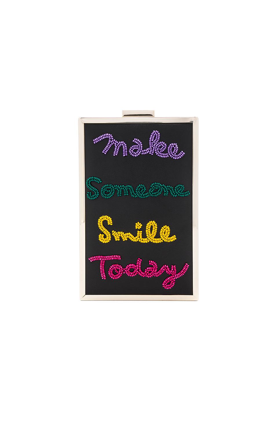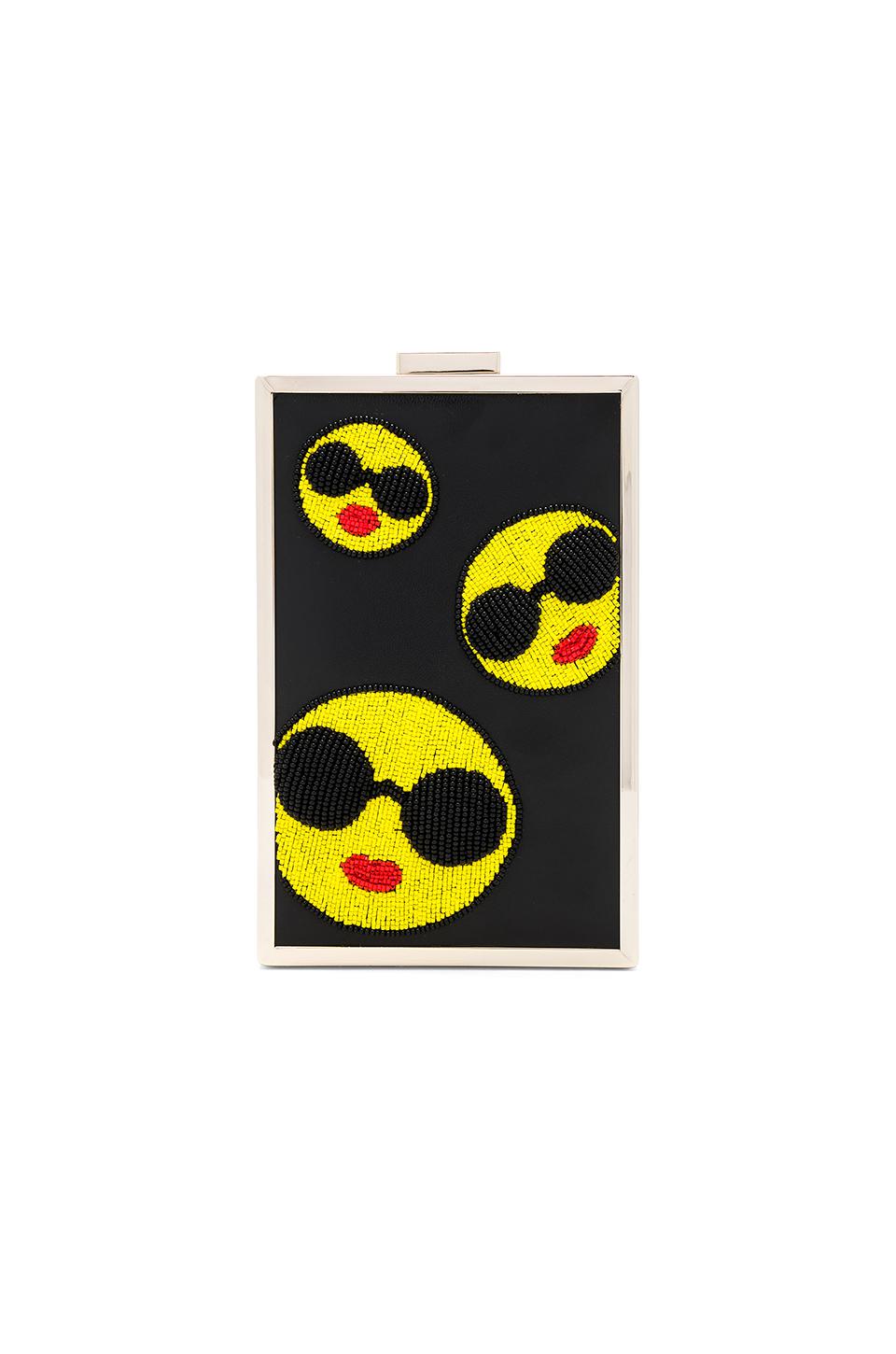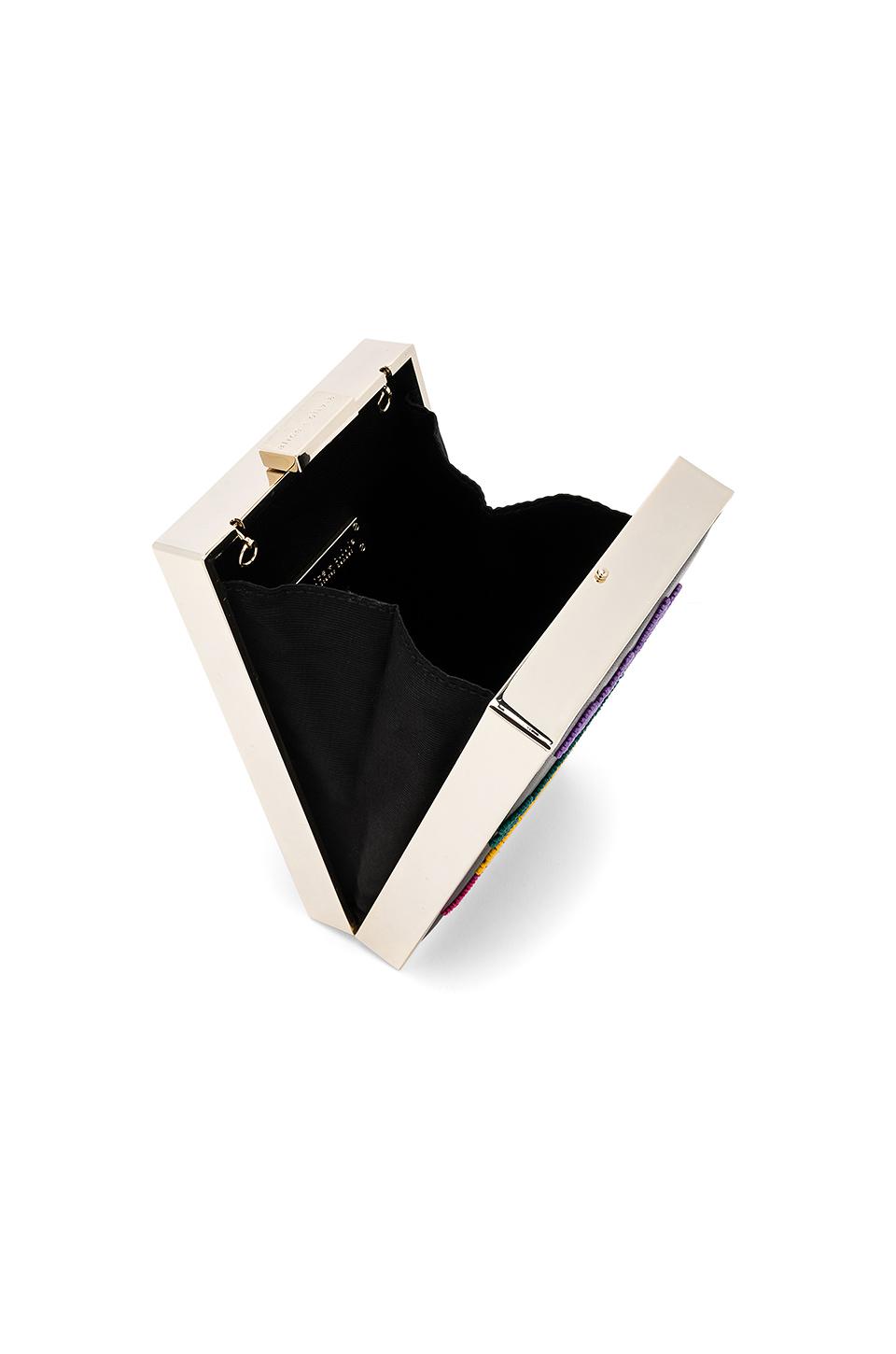 Leather and metal exterior with nylon lining. Top clasp closure. Interior slit pocket. Beaded graphics. Measures approx 4.5" W x 7" H x 2.5" D. Detachable chain shoulder strap measures approx 46" with a 22" drop. Colour: black