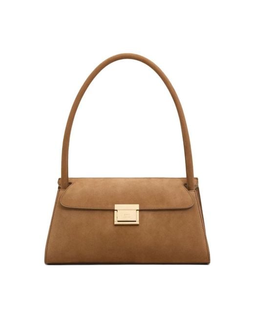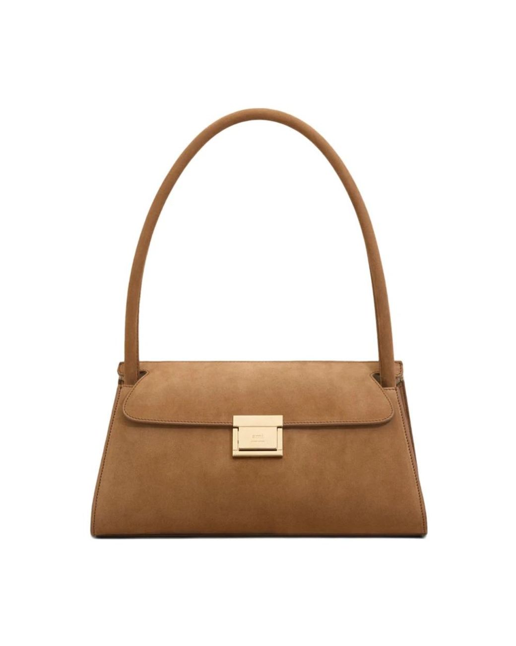 AMI Paris Mimi Shoulder Bag pairs studded brown suede with a magnetic engraved-logo closure for a refined everyday shoulder bag. It offers organized interior storage and a leather handle for easy carry. Key attributes: Brown | Suede | Magnetic closure with engraved logo | Two interior compartments | Interior zip pocket | Stud detailing | Engraved logo | Top leather handle | Structured silhouette | Dimensions & fit: 30 x 14 x 22 cm | Composition & care: Suede | Leather Colour: brown