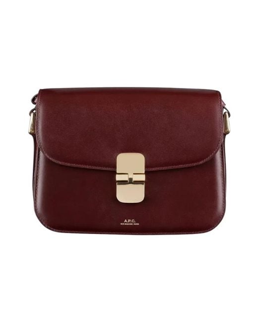 A.p.c. Grace Small Bag is a compact, vintage‑inspired leather crossbody designed to carry daily essentials. It stands out for its gold‑tone clasp, embossed logo and practical pocket layout. Key attributes: Red | Vinaccia | Cowhide leather | Soft cowhide leather | Adjustable shoulder strap | Gold‑tone metal clasp closure | One main compartment | Two large pockets | Two gold‑tone rings on the sides | Can be worn as a shoulder or crossbody bag | Trapezoidal silhouette | Embossed gold 'A.p.c. Rue Madame Paris' logo | Flap lined with suede split leather | Gold‑tone hardware | Dimensions & fit: Adjustable shoulder strap: 36 cm and 49 cm | Can be worn on the shoulder or across the body | Composition & care: 100% cowhide leather Colour: red