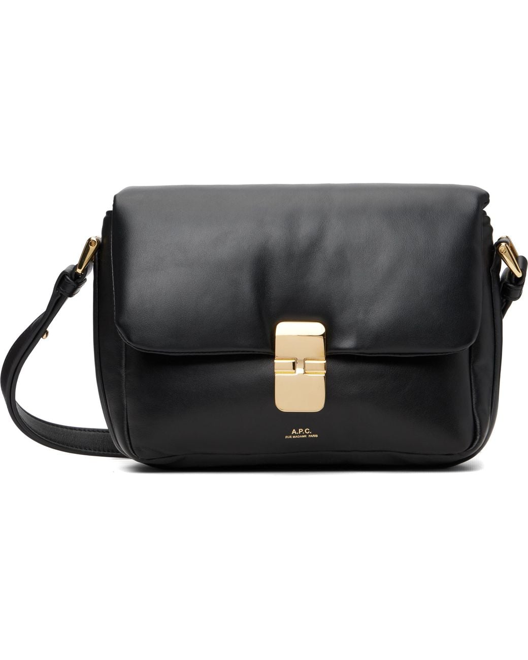Padded buffed leather shoulder bag. · Adjustable crossbody strap · Logo stamp at face · Magnetic press-stud flap · Patch pocket at interior · Cotton canvas lining · H7 x W9 x D3.5 Supplier color: Noir Colour: black
