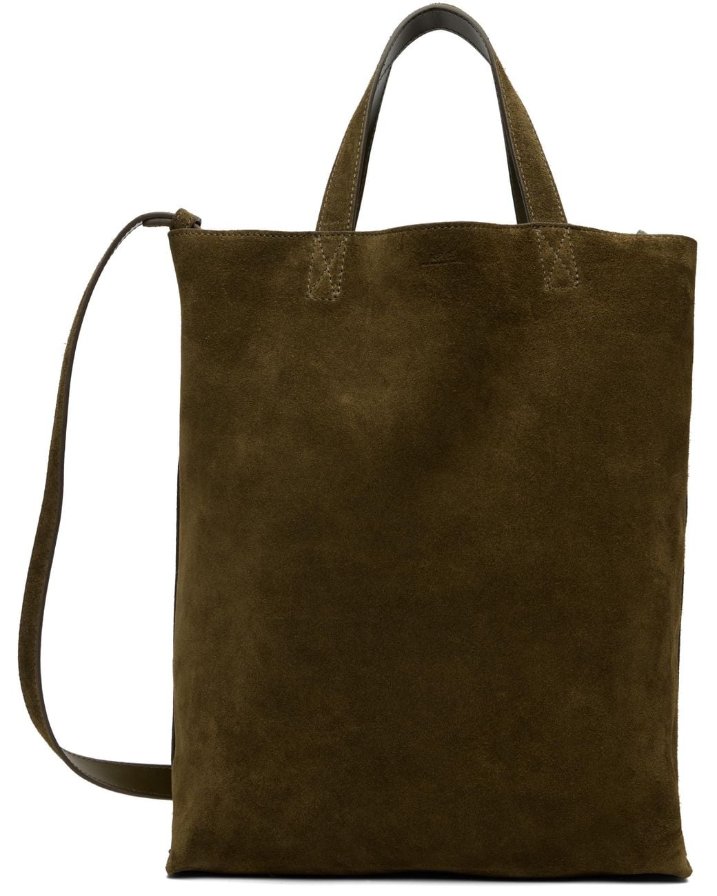 Calfskin suede tote. · Twin carry handles · Adjustable and detachable shoulder strap · Logo embossed at face · Open throat · Zip pocket at interior · Unlined · H13 x W10 x D4 Supplier color: Khaki fonce Colour: green