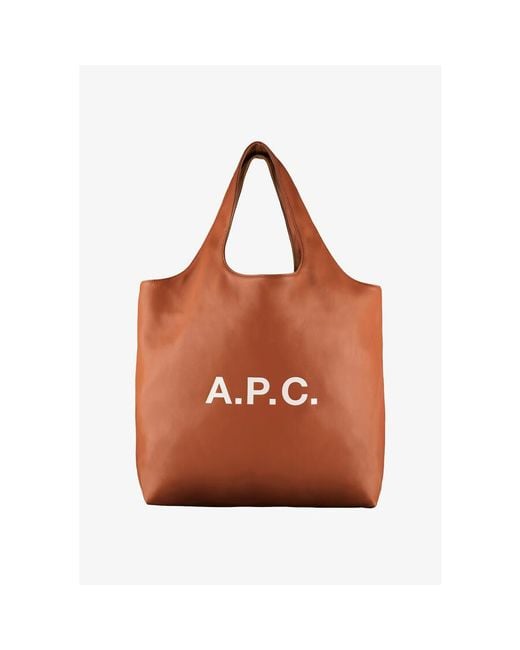 A.P.C. Unisex Tote. Ninon series. SKU: PUAAT-M61565-CAD NOISETTE. Color: Brown. A.P.C. Ninon Tote Bag. The Ninon Tote Bag is crafted from nut brown recycled leather-like material. It features two large handles for hand or shoulder carry, an interior pocket for essentials, and a subtle white A.P.C. logo for a minimalist finish. Details: Two large handles for hand or shoulder carry. Interior pocket. White logo detail. Dimensions: 17.7 W x 14 H x 5.5 D (45 x 35.5 x 14 cm). Material: Recycled leather-like. Colour: brown