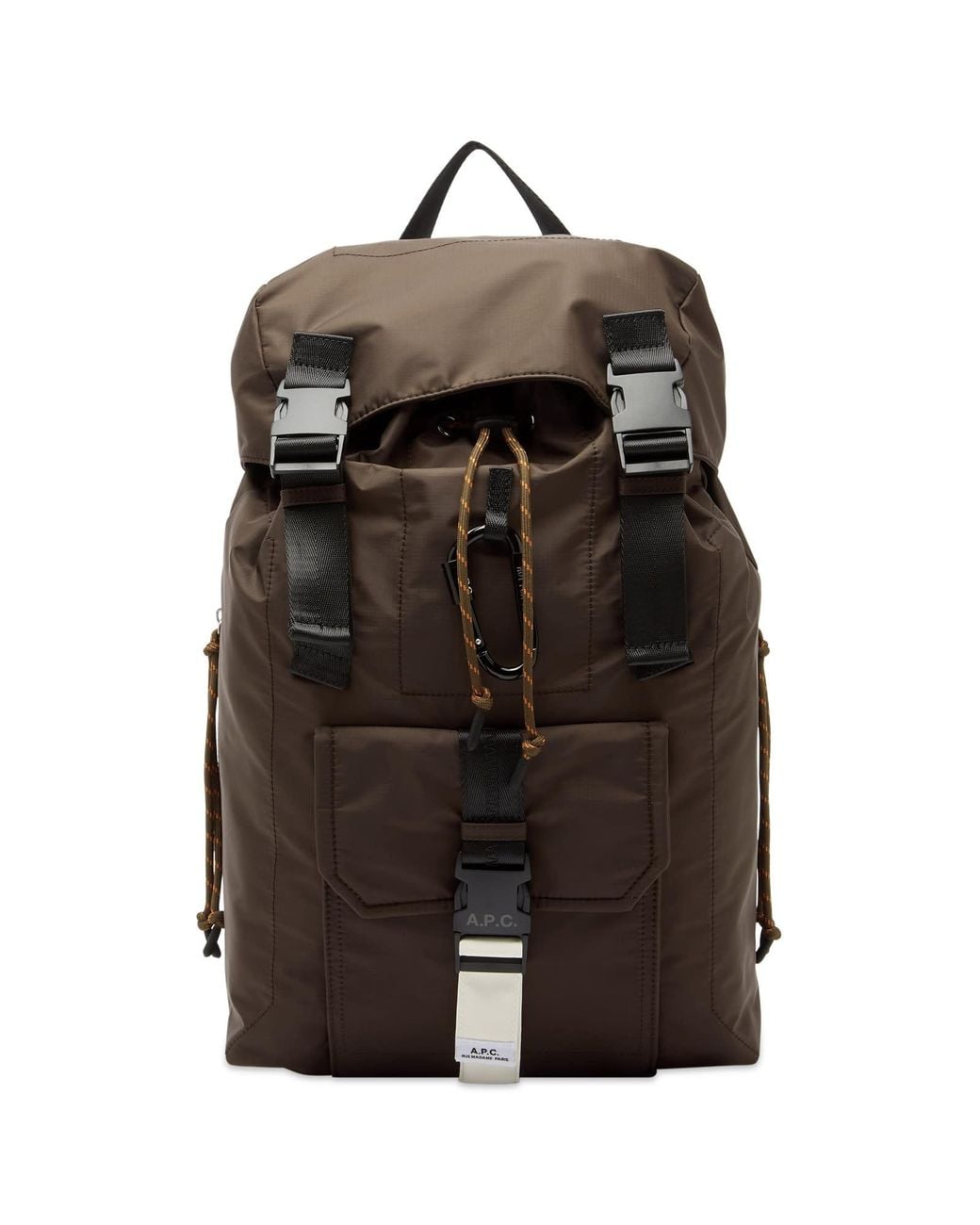 A. P.C. brings its practical, minimalist design ethos to the Trek backpack, crafted from durable recycled nylon for everyday wear. The silhouette is defined by two oversized plastic buckles and a large front pocket secured with the same buckles, stamped with the A. P.C. logo. Climbing rope-style drawstrings and a removable black carabiner add an outdoor feel, making it a standout piece that blends function and fashion. 100% Nylon, 2 Buckle Closures, Front Pocket with Branded Buckle, Adjustable Strap, Climbing Rope Drawstring, Removable Carabiner, Style Code: PAAGS-H62220-CAA, Shop All Men's A. P.C. Backpacks, Shop All Men's Backpacks, - A.P.C. Men's Trek Backpack Brown