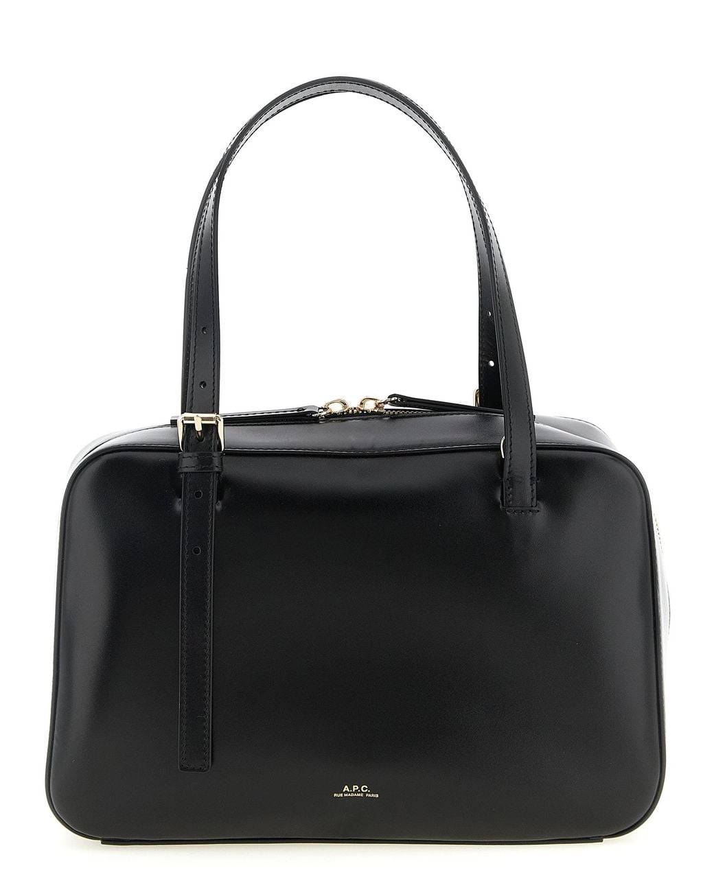 'Virginie Box' smooth leather handbag, front embossed 'A. P. C. Rue Madame Paris' logo, top zip closure, double adjustable handle, cotton lining, adjustable and removable shoulder strap. Composition: 100% cow leather (Bos Taurus)