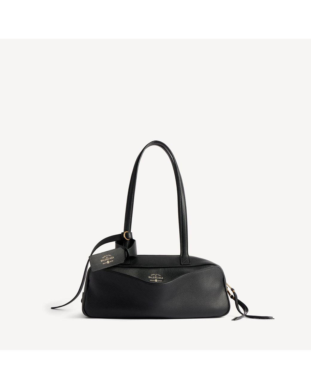 Carrie Small Bowling Bag in black calfskin, aged-gold hardware. Dimensions: l12,2 x h4,7 x w4,7 inch calfskin bowling bag two handles with one handle clip (drop: 10,2 inch) shoulder and hand carry removable leather luggage tag balenciaga logo debossed with foil at front aged-gold hardware front wide pocket zipped closure with leather puller 1 main compartment 1 inner zipped pocket nappa lambskin lining made in italy. Material: calfskin.