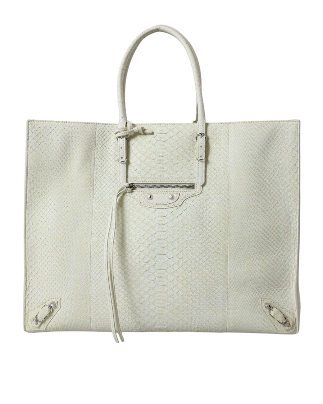 Indulge in the epitome of luxury with this stunning Balenciaga tote bag. Exquisitely crafted from premium pythonskin leather, this authentic, brand new bag boasts a sleek white and lemon yellow hue that is sure to turn heads.