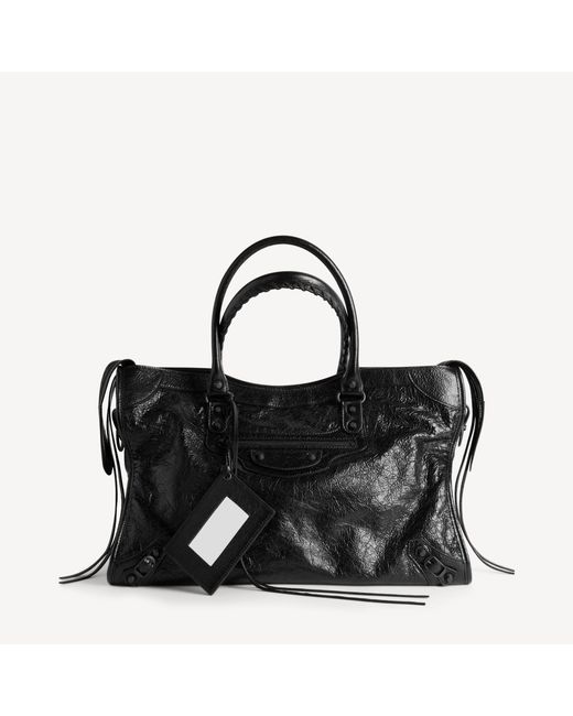 Le city bag large in black arena lambskin, matte black hardware. Arena lambskin• two hand-braided handles with waxed cord• adjustable and removable shoulder strap with shoulder pad• crossbody and hand carry• matte black hardware• double-sided zip with long tails and knotted leather puller• front zipped pocket with knotted leather puller• 1 inner zipped pocket• 1 removable mirror• tone-on-tone balenciaga logo debossed on mirror• cotton canvas lining• made in italy. 70% lambskin, 10% cotton, 10% brass, 10% plexiglass. Colour: black