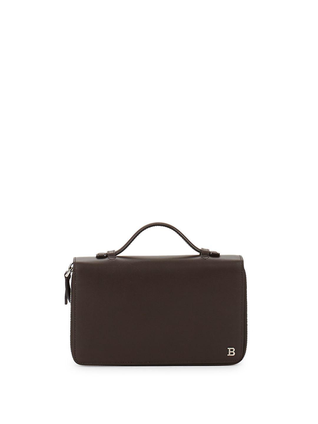 Go to GiltLeather wallet with multiple credit card slots. Leather top handle, 1.5 drop". Double zip-around closure. Leather trim. Silvertone hardware. One inside zip pocket. Two inside open pockets. Includes dust bag. 9" W x 5" H x 2" D. Leather. Made in Italy. Leather. Bally. Colour: brown