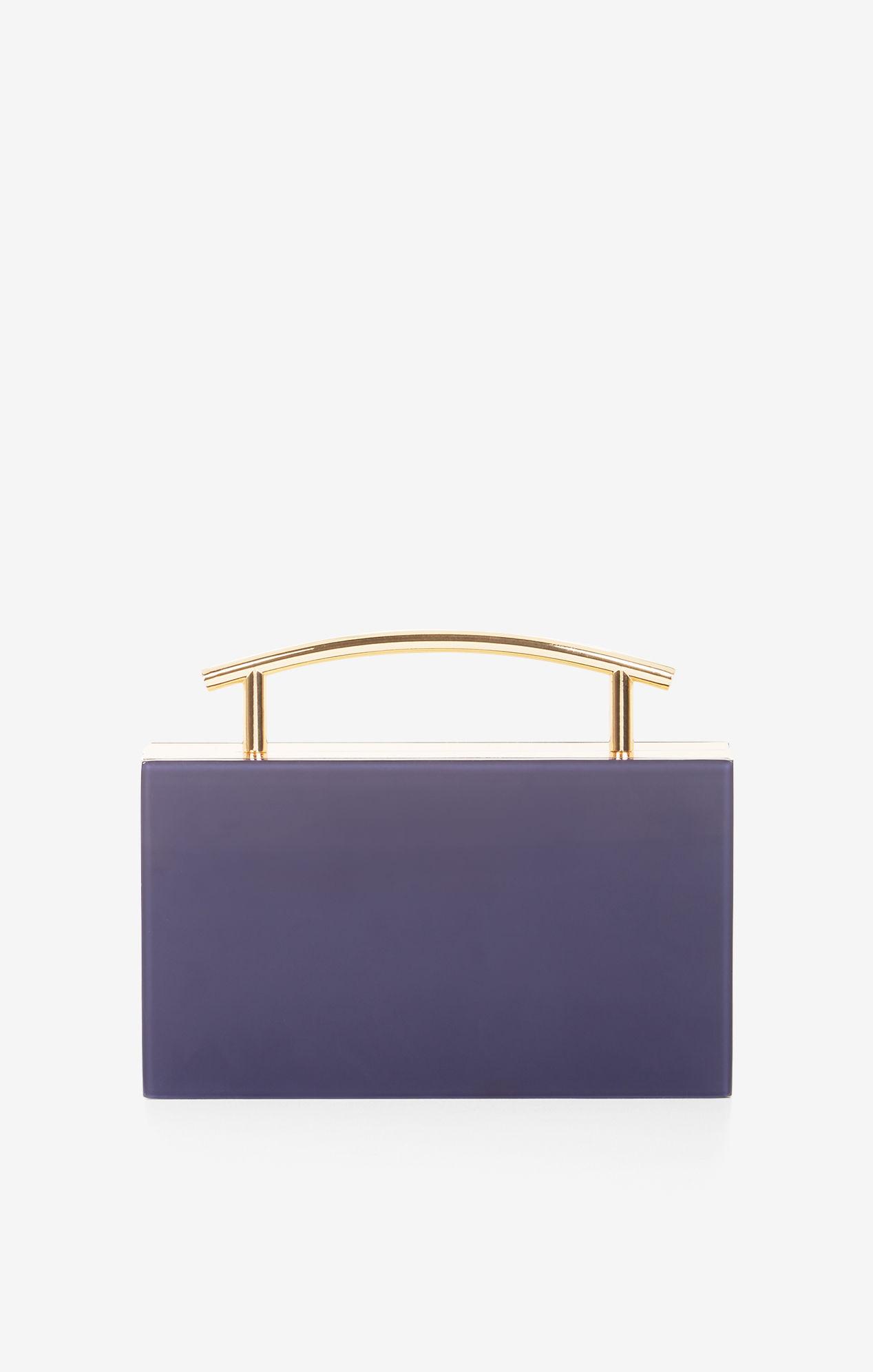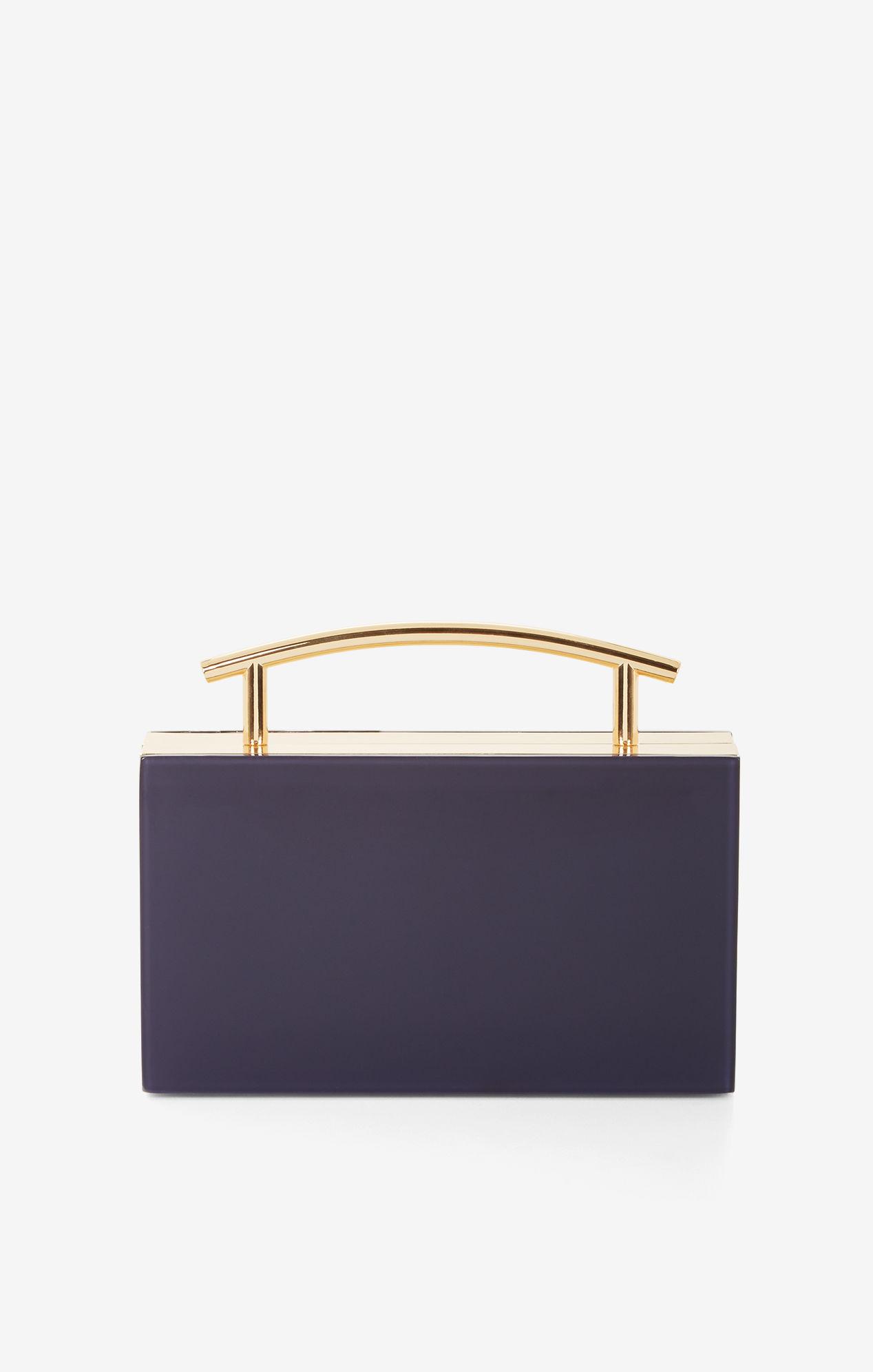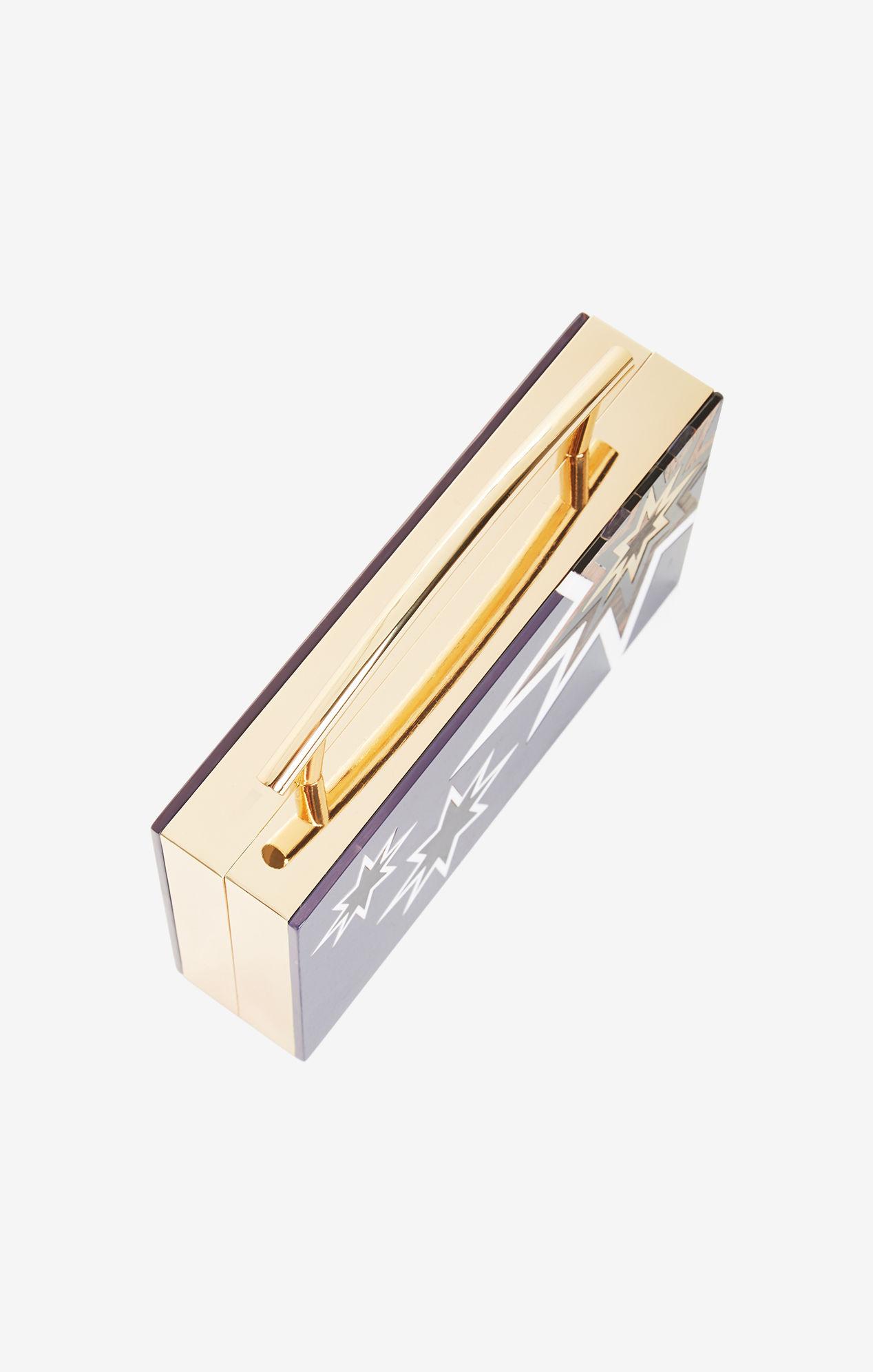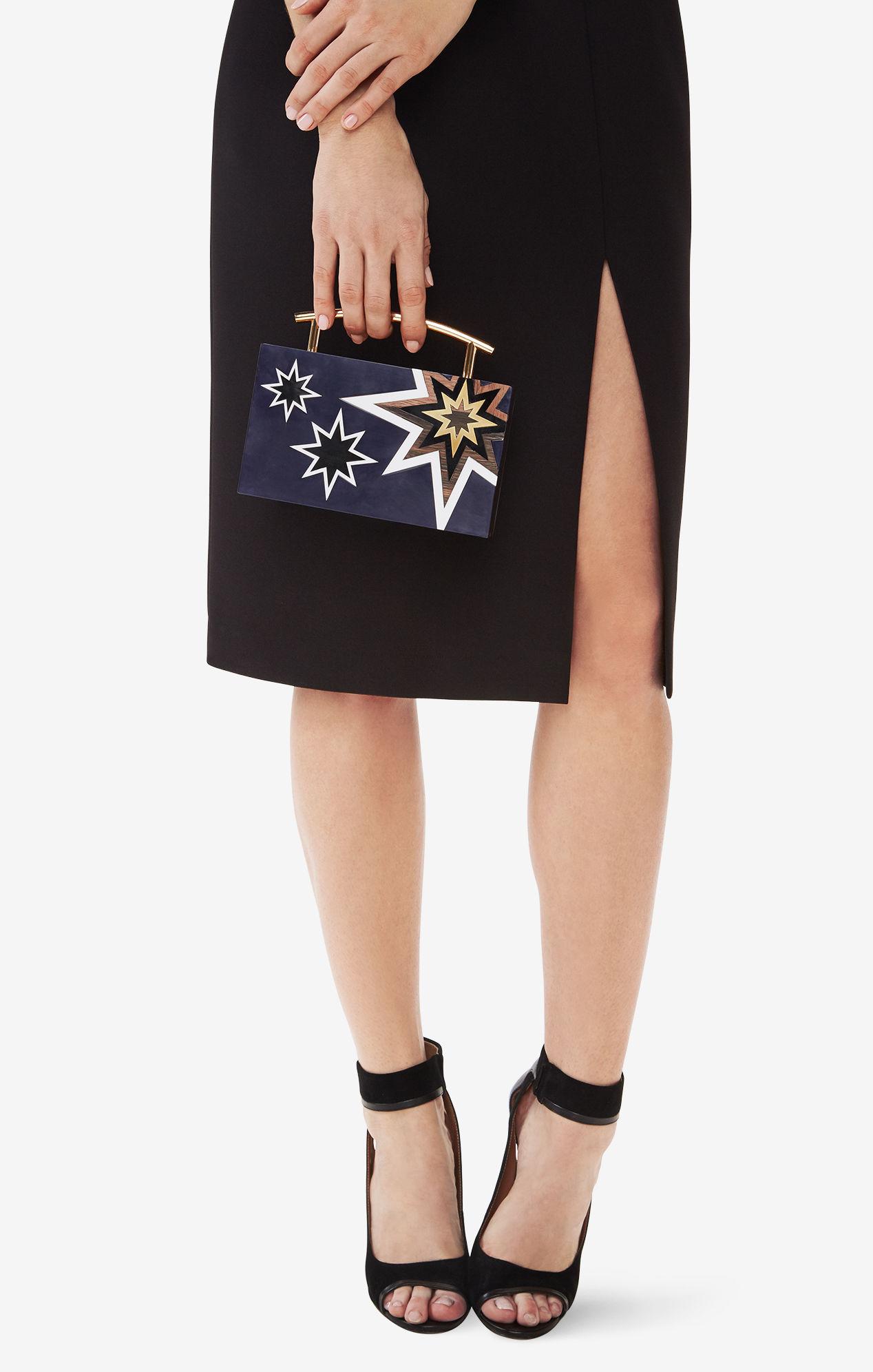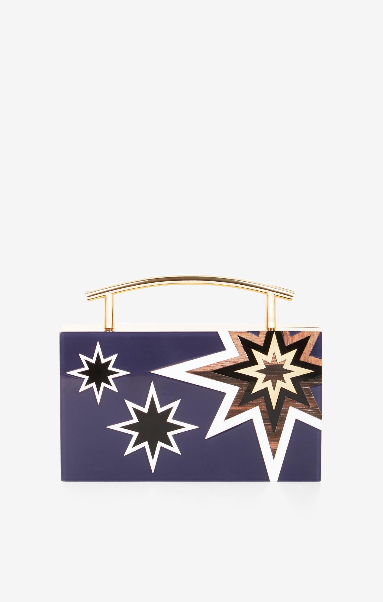 Go to BCBGMAXAZRIAThis rectangular clutch is decorated with graphic stars balanced with a touch of natural wood. Its metal handle lends the compact style a sleek and modern finish. Magnetic closure. Interior pocket. Materials: 1-3. 100% acrylic 4. 100% wood; lining: 100% rayon. Approximate dimensions: 4.25" H. 7.5" W. 1.75" D. 1.5" handle drop. Colour: blue