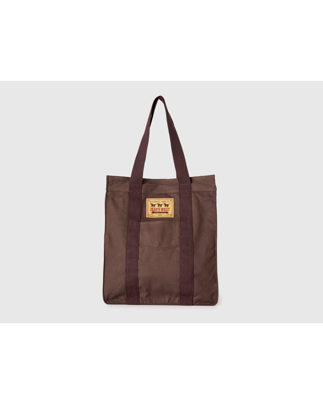 Pure cotton canvas tote bag with practical double handles for shoulder carry. One exterior pocket, jacron label with the iconic Jean's West three-horse logo. Interior snap closure, fabric lining, and interior zipper pocket. This item is part of Jean's West, our new collection inspired by the imagery of the Wild West. Colour: brown