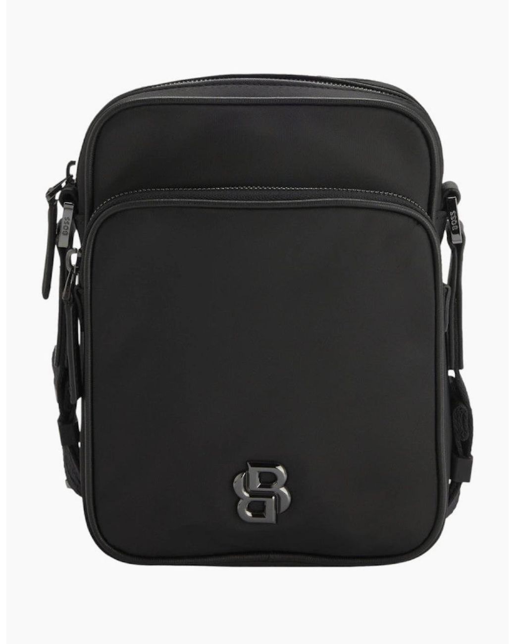 The BOSS Menswear reporter bag is crafted from smooth, matte twill and features a refined Double B monogram in polished gunmetal. It includes an adjustable shoulder strap for comfortable carrying. Measuring 20.5 x 7 x 16 cm (8.07 x 2.76 x 6.30 inches), the bag secures with a zip closure and offers one inside open pocket. The hardware is finished in polished gunmetal, complemented by a logo plaque for a sophisticated touch. Material: 100% Polyester, Lining: 100% Polyester, Facing: 100% Polyamide, 100% Regenerated leather. S1-26 50523462 B Icon NS Crossbag Colour: black
