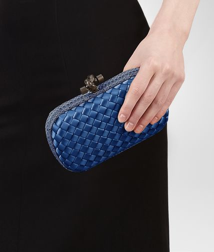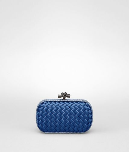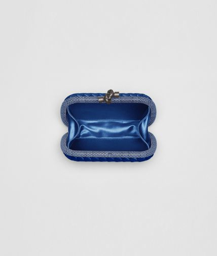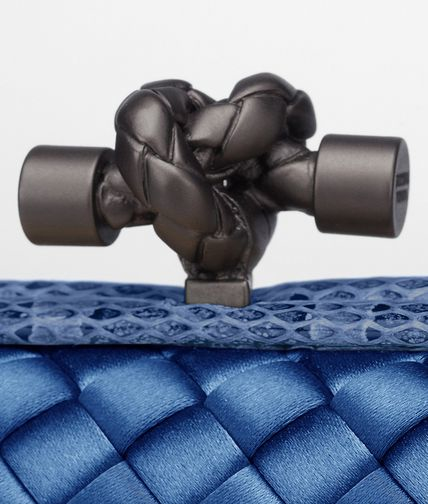 Go to Bottega VenetaOne of Bottega Veneta's most coveted clutch bags, the Knot is based on an archival design which was reintroduced in 2001.A masterpiece of artisanal craftsmanship, each interpretation reconfirms the irresistible beauty and timeless charm of this iconic bag. This striking version has been luxuriously finished in satin Intrecciato and precious ayers trim. Satin. Solid colour. Framed closure. Lined interior. Engraved logo. Textile fibres, Ayers. Colour: blue