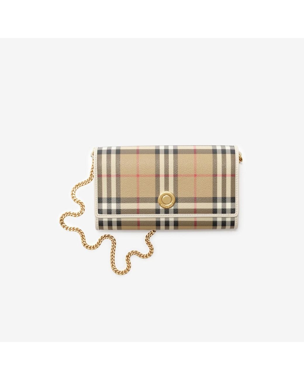 A chain strap wallet in a coated cotton blend, printed with the Burberry Check in signature archive beige and trimmed in tonal leather. The design is detailed with a logo-engraved press stud. Chain strap Foldover flap with press-stud closure 12 card slots Interior zip pocket Two interior compartments Hand-painted edges Brushed metal hardware Lined Comes with a dust bag Colour: natural